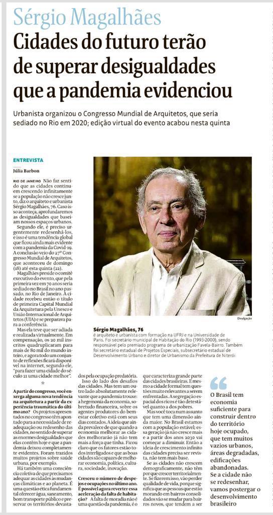 Sérgio Magalhães, 76, é arquiteto e urbanista com formação na UFRJ e na Universidade de Paris. Foi secretário municipal de Habitação do Rio (1993-2000), sendo responsável pelo premiado programa de urbanização Favela-Bairro. Também foi secretário estadual de Projetos Especiais, subsecretário estadual de Desenvolvimento Urbano e diretor de Urbanismo da Prefeitura de Niterói